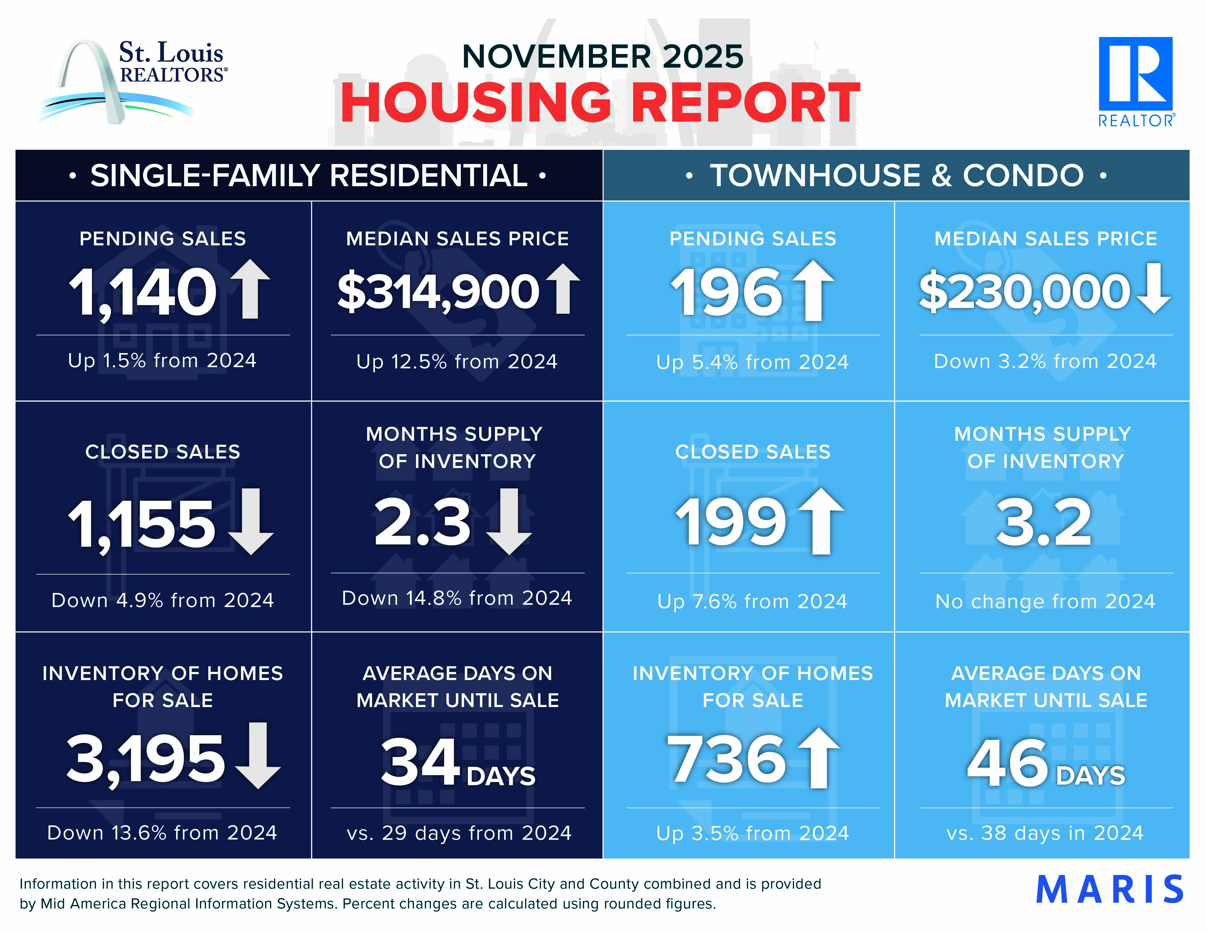 Median sales price increased 12.5% to $314,900 for residential homes but decreased 3.2% to $230,000 for townhouse/condo homes. Days on market increased 17.2% for residential homes and 21.1% for townhouse/condo homes. Months supply of inventory decreased 14.8% for residential homes but remained flat for townhouse/condo homes.